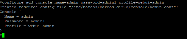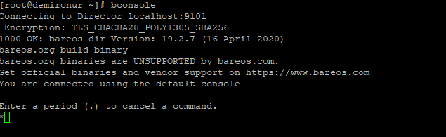 Bareos WebUi kurulumundan sonra login olunması için kullanıcı adı ve password oluşturmak için “bconsole” komutuyla giriş yapış yapılır.