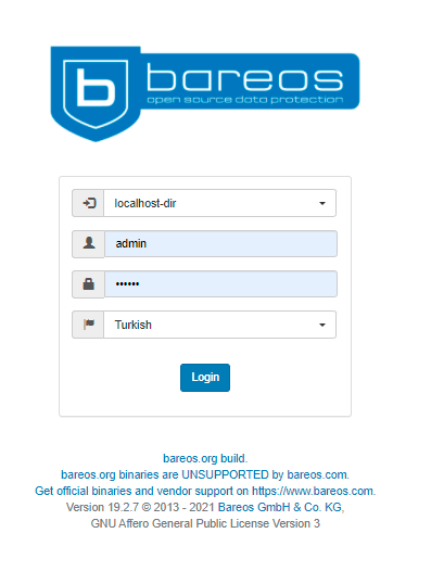 Şimdi web tarayıcınızda “http://your-server-ip/bareos-webui” Url’i kullanarak giriş yapabilirsiniz.