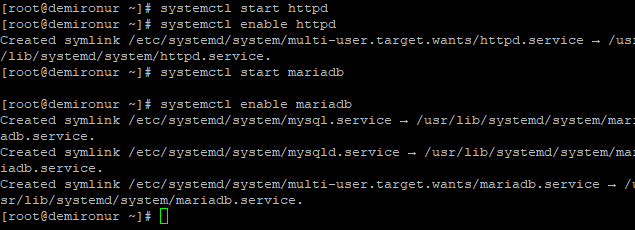 Tüm paketler kurulduktan sonra, Apache ve MariaDB hizmetlerini başlatın ve aşağıdaki komutla sistem yeniden başlatıldığında başlamalarını sağlayın:
