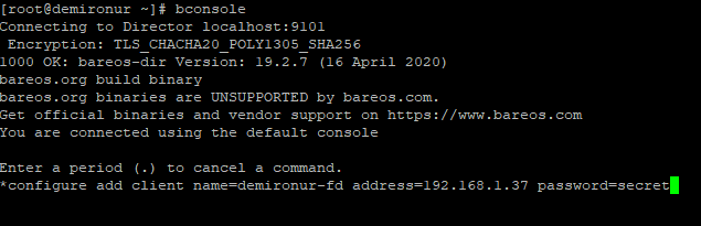 Bareos kurulu olan sunucuda bconsole giriş yaparak aşağıdaki komutla client ekliyoruz.