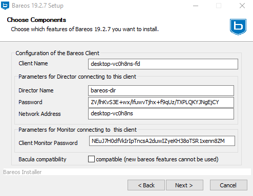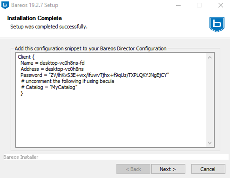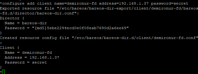 Kurulum tamamlandıktan sonra ekranlardaki bilgileri Bareos Director client ( /etc/bareos/bareos-dir.d/client/) kısmına eklemek gerekir.