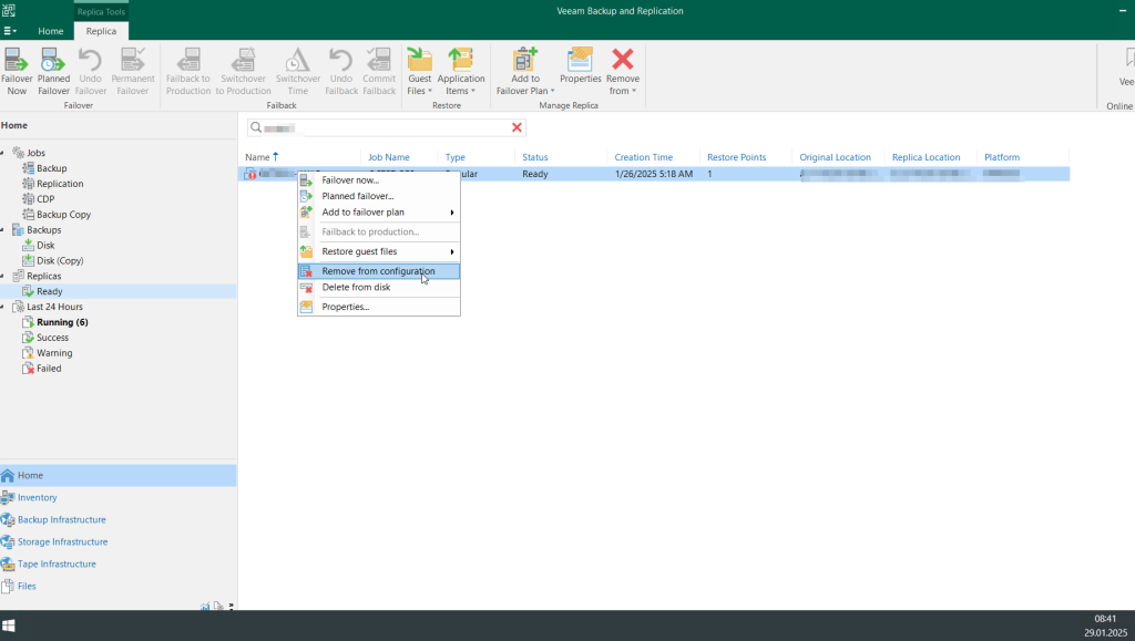 1-Veeam Backup & Replication Console > Home > Replicas > Ready kısmında hata veren VM’ler “Remove from configuration” database yapılanmasından düşürülür.