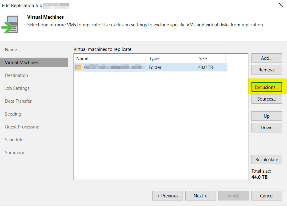 4-Sanal sunucular kısmında type “Virtual Machine” olarak ekliyse, göreve yeniden eklemeniz gerekmektedir. Type Folder, Resource Pool, Cluster gibi seçili ise, Exclusions > VMs > Objectsto exclude kısmında Remove from configuration yaptığımız sunucuları buradan da Remove ederek replikasyon görevinde aktif etmemiz gerekecektir.