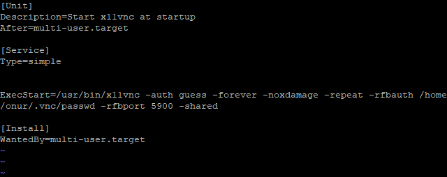 ExecStart=/usr/bin/x11vnc -auth guess -forever -noxdamage -repeat -rfbauth /home/KULLANICI_ADINIZ/.vnc/passwd -rfbport 5900 -shared